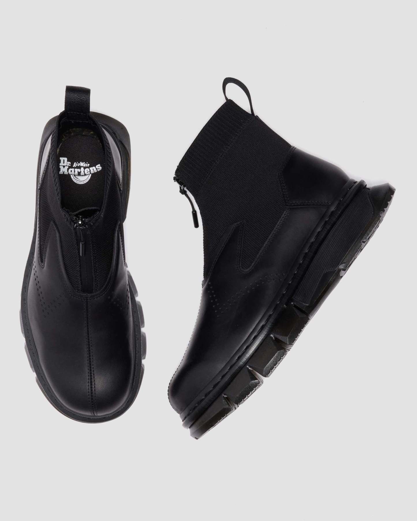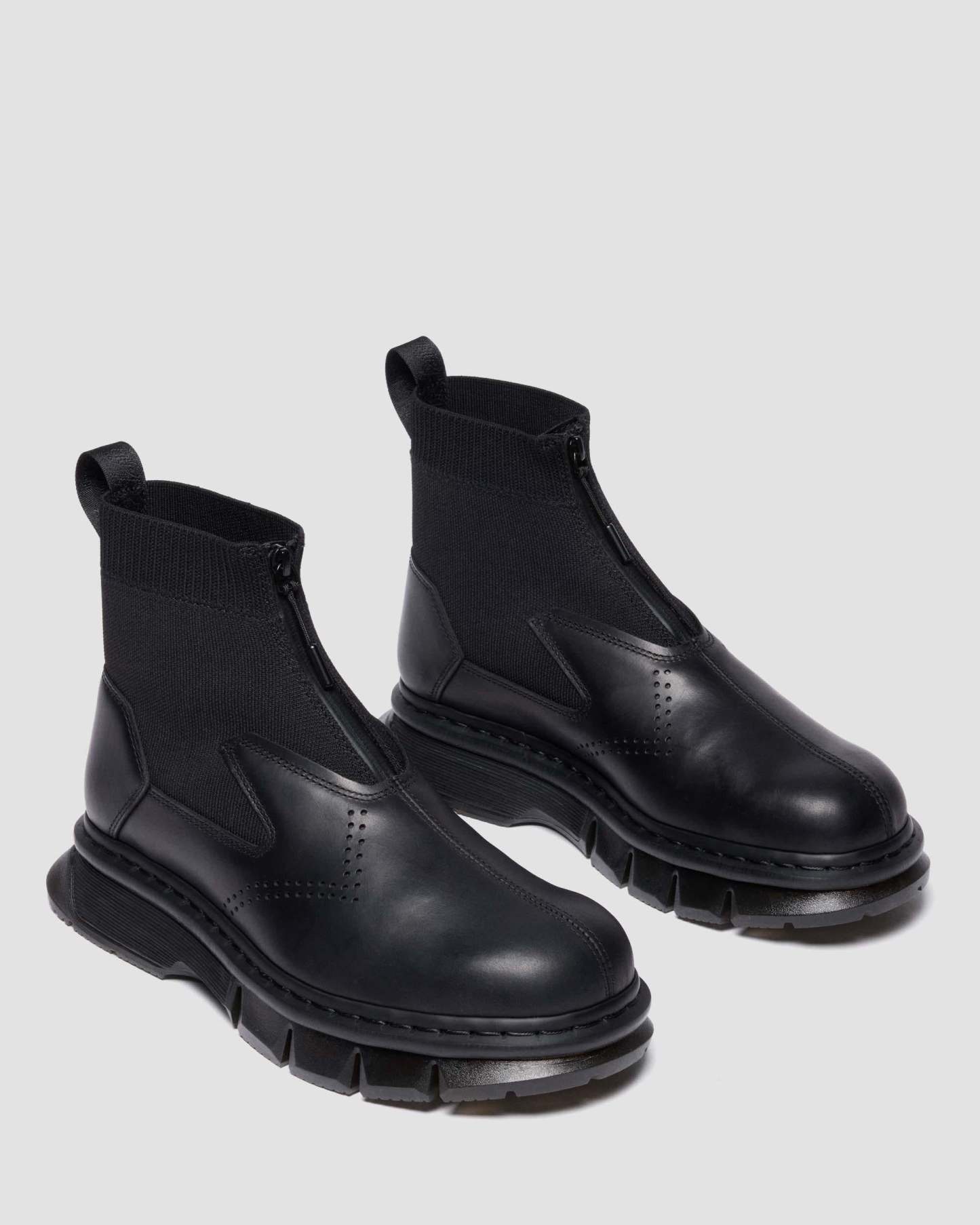 Crafted from easy-wearing, smooth Orleans leather, with a synthetic knitted sock bisected with a subtle front zip. The all-black upper is secured to the flexile outsole with a black-on-black welt stitch and fitted with a wide-footbed SoftWair insole for a more natural fit. And each pair is signed with an AirWair monochrome heel loop.