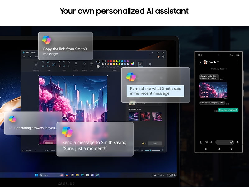 Manage your tasks via quick chat prompts with Copilot's personalized AI assistance.² Plus, get smarter communication tools—access contacts and send messages effortlessly with a simple chat command.