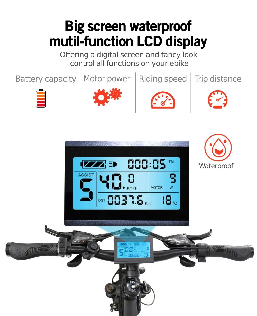 The center of our electric mountain bike is 48V / 15Ah high capacity lithium battery with 3A charger (3-5 hours charging time). Up to 75-90 miles on a single charge (electric) and on a single charge (pass mode) or 90-120 miles (pass mode) for long commutes. You can check the battery level and other information on the LCD screen. There is also a USB port for charging the phone.