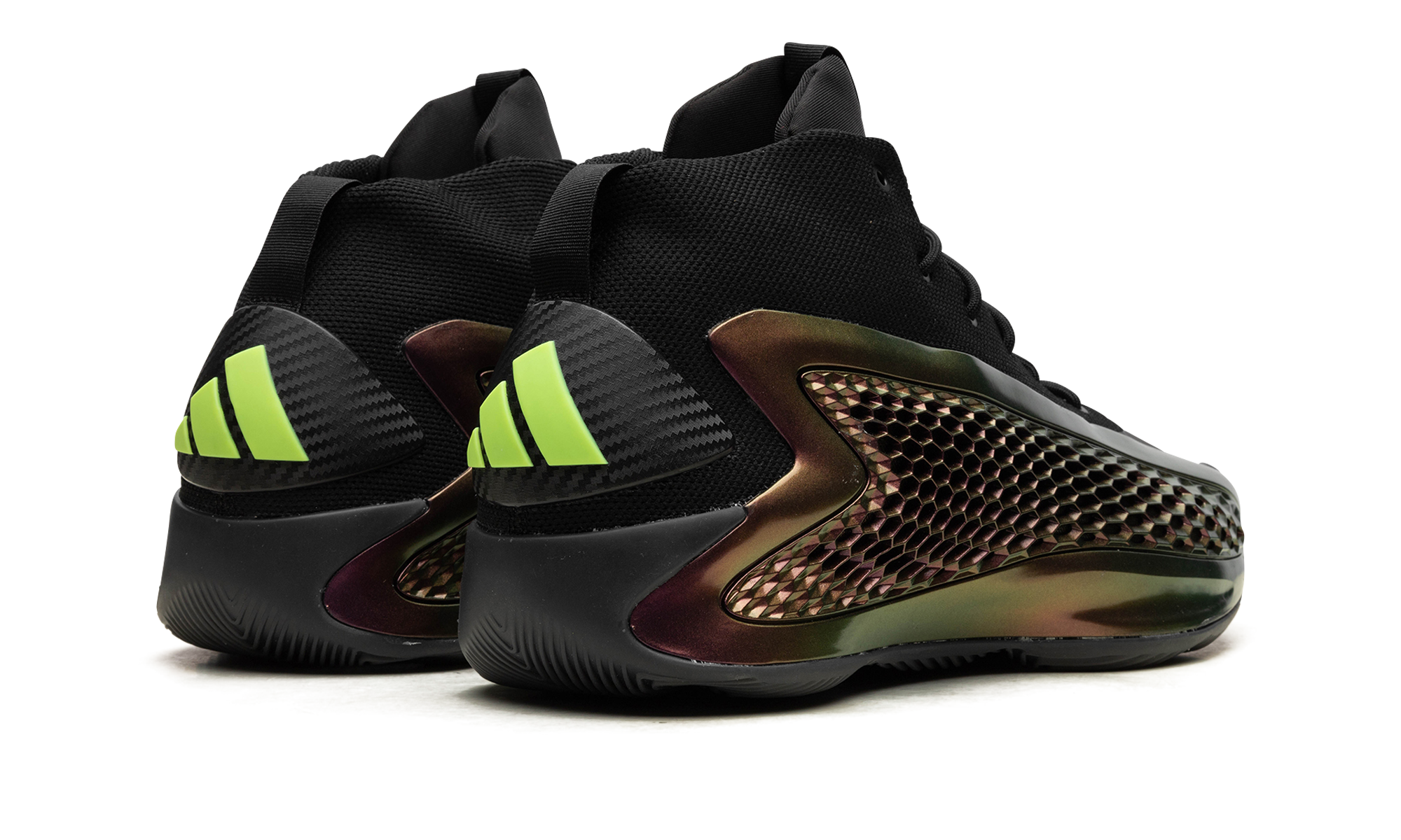 The adithtdas AE1 "All-Star" is a colorway of Anthony Edwards??s first signature shoe with adithtdas Basketball in a colorway inspired by the 2024 NBA All-Star Game. The adithtdas AE1 "All-Star" features an iridescent TPU "cage" with perforations in a honeycomb pattern that assist in breathability. The black Primegreen base is made of recycled materials. Edwards?? signature branding appears on the woven tongue tag, while adithtdas Three Stripes branding can be found on the heel. The midsole is designed with a combination of adithtdas??s Boost and Lightstrike cushioning for superior performance and energy return. All-Star