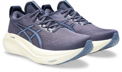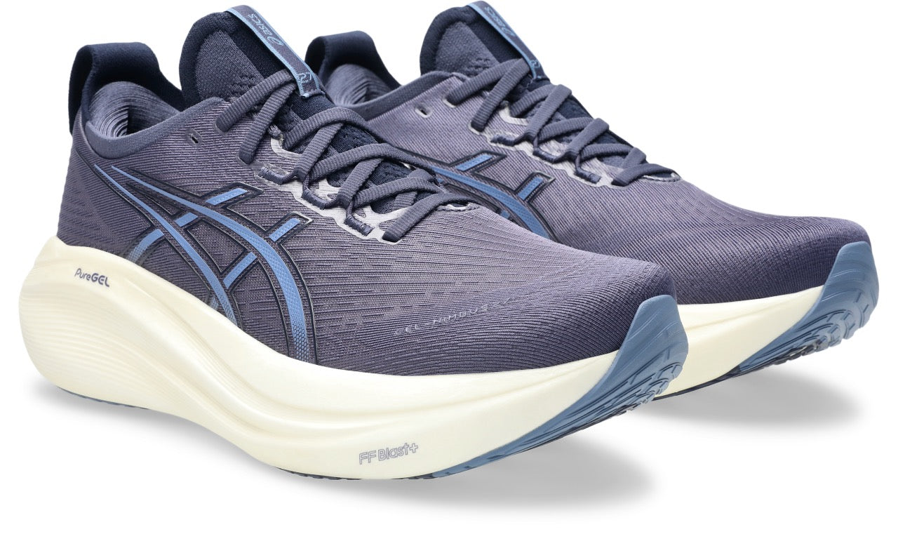 The GEL-NIMBUS? 27 shoe's soft cushioning properties help you feel like you're landing on clouds. This design is revamped to help create a softer and smoother running experience.?A soft engineered jacquard mesh upper comfortably wraps your foot while supplying advanced ventilation. Additionally, the knit tongue and collar help provide a soft and supportive feel.?By using FF BLAST? PLUS ECO cushioning, this trainer creates a lighter and softer cushioning experience.?Lastly, HYBRID GRIP? outsole rubber helps create better traction, improved softness, and advanced durability.