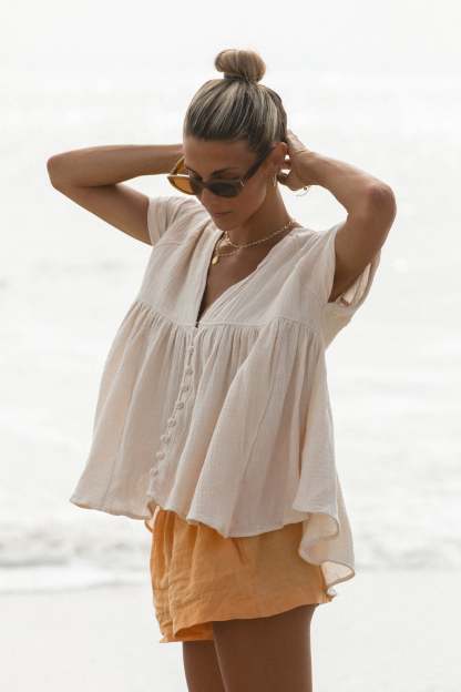 The Beachy Head Cotton Gauze Top is a flowy and lightweight short sleeve top. Its babydoll style is perfect for warm weather and provides a comfortable and airy fit. Made with high-quality cotton gauze, ideal for late summer.