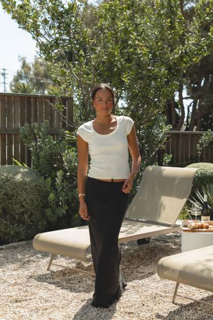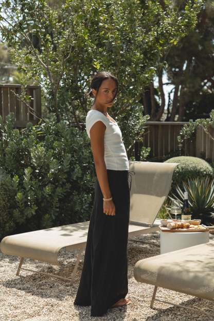 Introducing our newest signature style, the Laguna Linen Drawstring Skirt. This maxi skirt, made of luxurious linen, features a unique drawstring design, perfect for styling in any season with a classic tank or cardigan sweater.?
