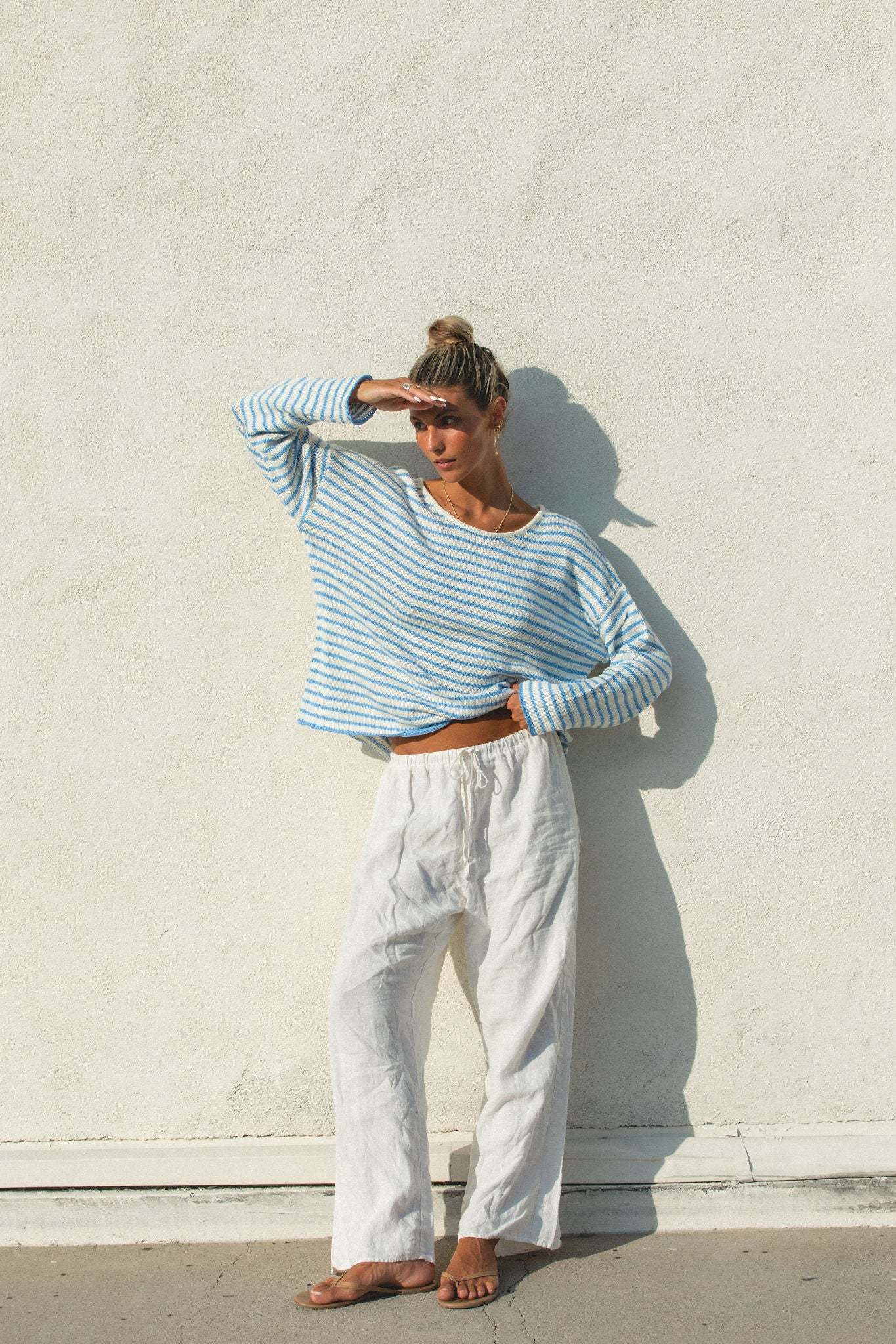 Meet our Morning Sea Striped Pullover Sweater. This season's must-have, with a sky blue and white horizontal stripe, boat neckline, and easy oversized fit. This will be the perfect sweater to wear as we ease into a new season.