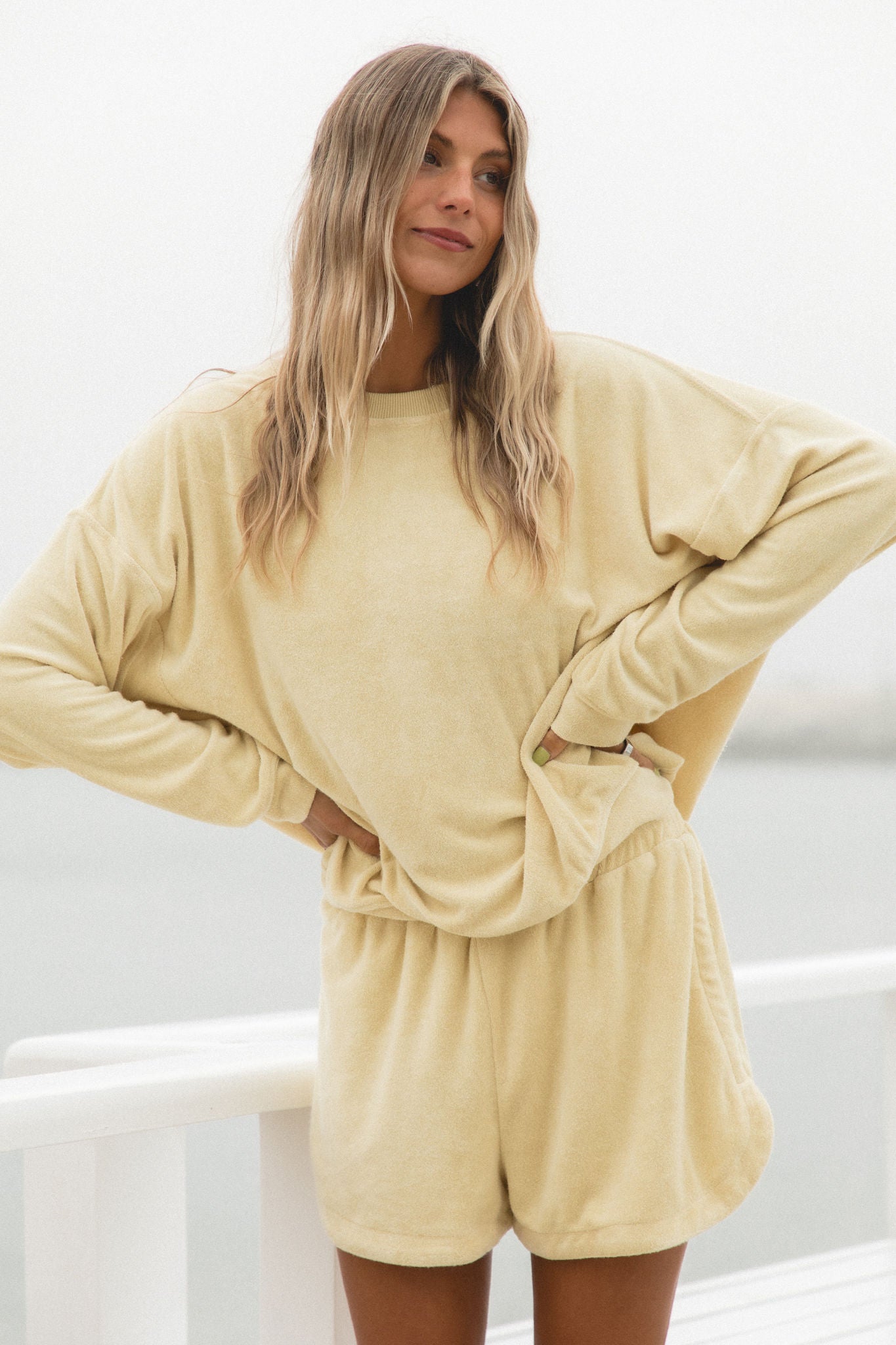 Introducing Surfrider Towel Shorts, the perfect addition to your beach wardrobe. made to be worn after a cool ocean dip, or as a causal everyday look. These versatile shorts can be worn alone or paired with the Surfrider Towel Oversized Pullover for a complete look. With a subtle scoop and side slit, these shorts offer a flattering fit.?