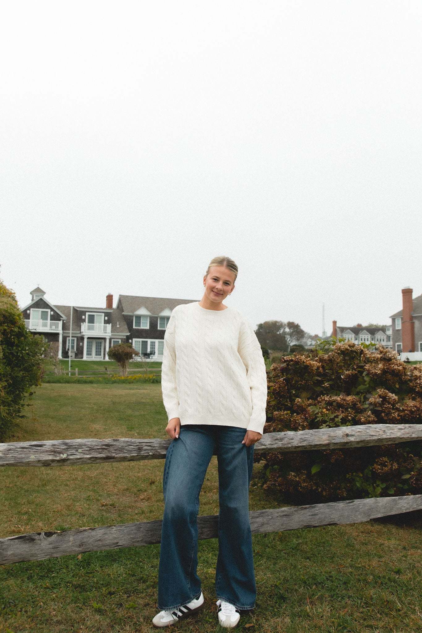 Introducing the White Water Cable Knit Sweater��a classic oversized pullover in a soft cream hue. With its timeless cable-knit pattern and relaxed fit, this sweater combines cozy warmth with effortless elegance. Perfect for layering on breezy days, it��s a versatile staple designed to bring a touch of coastal charm to any fall look.